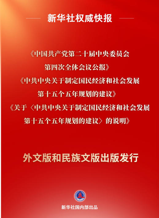 《中国共产党第二十届中央委员会第四次全体会议公报》《中共中央关于制定国民经济和社会发展第十五个五年规划的建议》《关于〈中共中央关于制定国民经济和社会发展第十五个五年规划的建议〉的说明》的英文、法文、西班牙文、日文、俄文、德文、阿拉伯文、葡萄牙文、越南文、老挝文等10种外文版已由中央编译出版社、外文出版社出版,即日起向国内外公开发行。