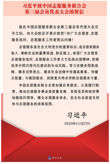 中国志愿服务联合会第三届会员代表大会27日至28日在京召开,会上宣读了习近平的贺信。