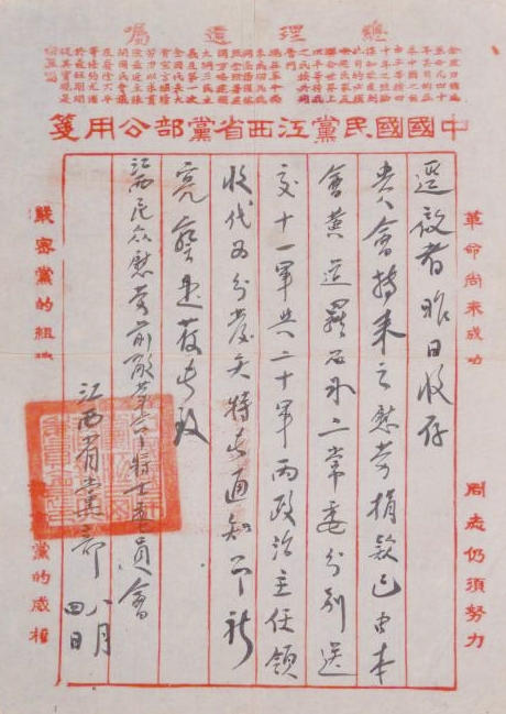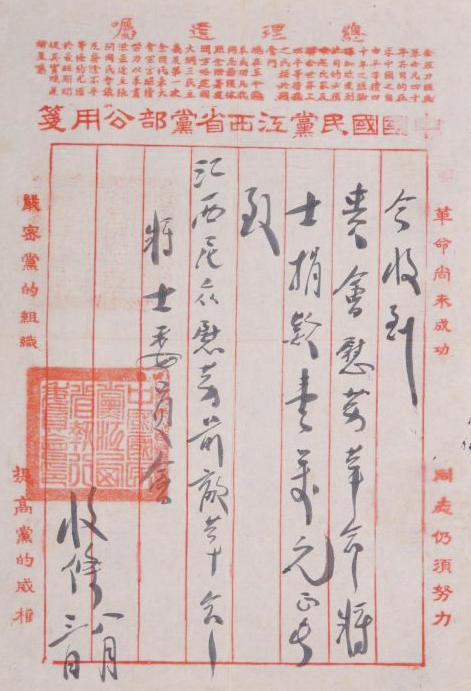 从文书形制看,收条采用“明八行”公文信笺书写,内容为“今收到贵会慰劳革命将士捐款壹万元整”,末尾加盖“中国国民党江西省党部之印”;回信则使用“中国国民党江西省党部公用笺”,写明捐款处置情况并同样加盖公章。这一细节背后,是当时特殊的政治语境:国民党右派已公开叛变,但共产党员方志敏、罗石冰、黄道等仍以省党部执行委员身份,依托该平台开展隐蔽工作——用“中国国民党江西省党部公用笺”处理捐款事宜,既符合当时的组织名义,也为革命活动提供了安全掩护,体现了早期中共革命斗争的灵活性与策略性。
