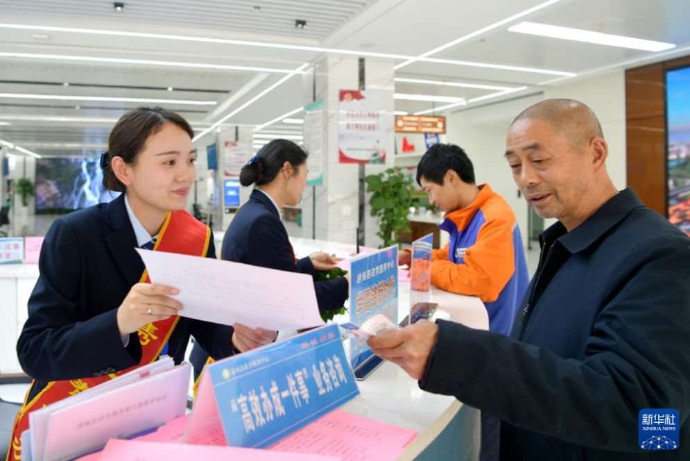 4月10日,在湖北省咸宁市通城县政务服务中心“高效办成一件事”窗口,工作人员为村民办理业务。新华社发(刘建平摄)