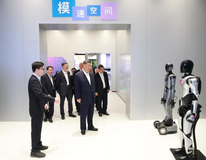 4月29日,中共中央总书记、国家主席、中央军委主席习近平在上海考察。这是习近平在位于徐汇区的上海“模速空间”大模型创新生态社区人工智能产品体验店考察。新华社记者 谢环驰 摄