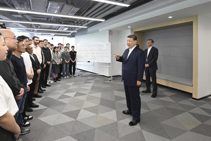 4月29日,中共中央总书记、国家主席、中央军委主席习近平在上海考察。这是习近平在位于徐汇区的上海“模速空间”大模型创新生态社区,听取相关技术研发和企业生产经营介绍。新华社记者 王晔 摄